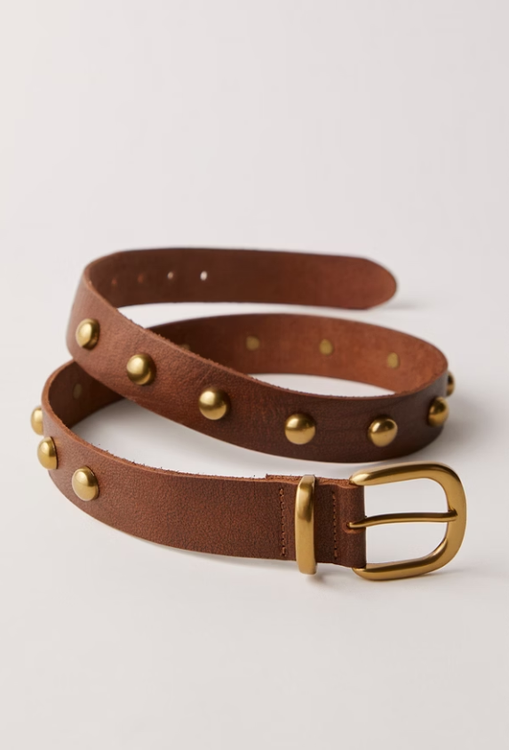 The Rhodes Stud Belt in Cognac by Free People is an elevated twist on a timeless silhouette, this belt is crafted from soft leather and accented with bold, chunky metal studs. Designed with a medium width and an adjustable buckle closure, it’s the perfect piece to add a touch of edge to any look.
