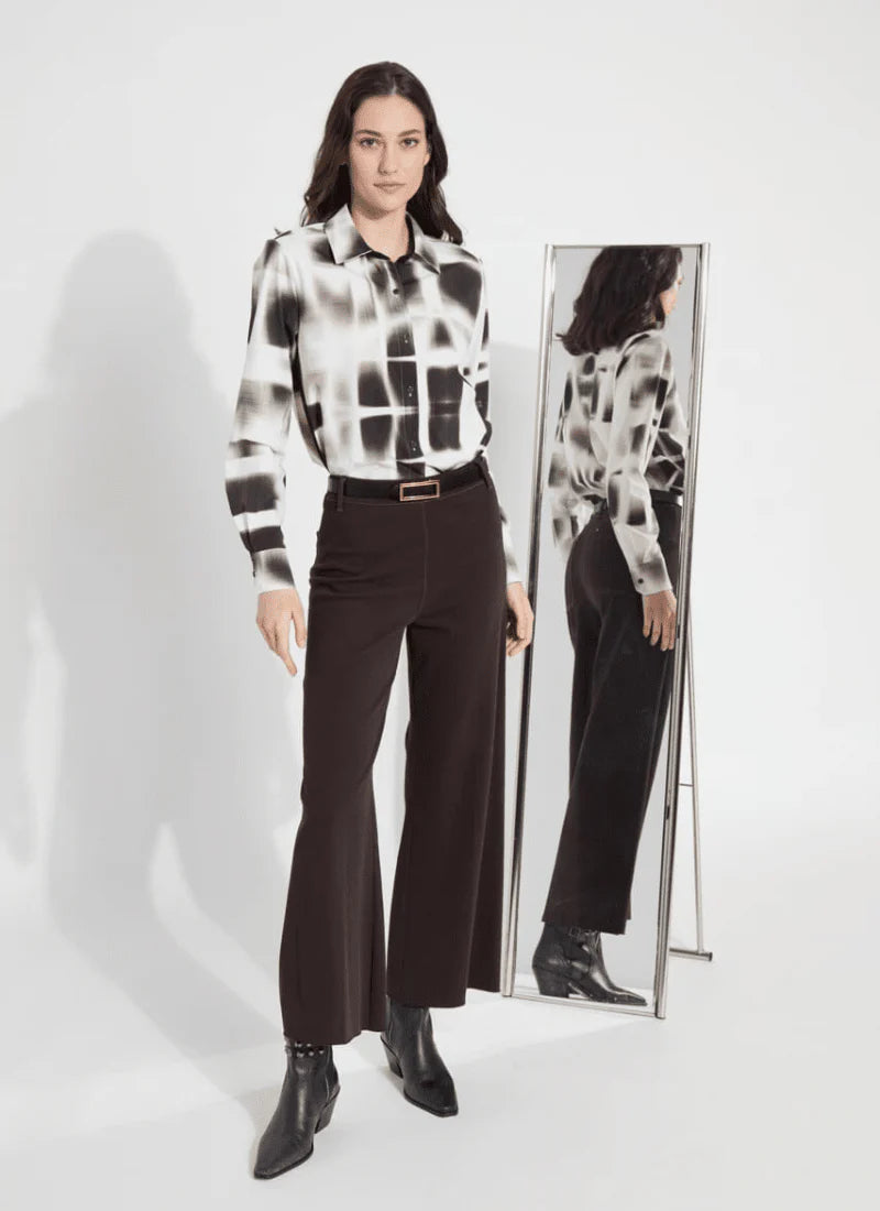 Effortlessly chic, the Erin Wide Leg Denim in Double Espresso redefines modern denim with a polished edge. Crafted from 4-way stretch knit denim, these high-waisted wide-leg jeans feature a concealed patented waistband, back patch pockets with gunmetal studs, and sleek no side seams for a smooth, elongating fit. The cropped, ankle-length silhouette and raw-edge hem offer easy tailoring and contemporary flair—perfectly styled with a tucked blouse, blazer, and ankle boots for elevated everyday style.