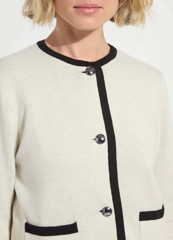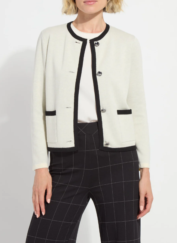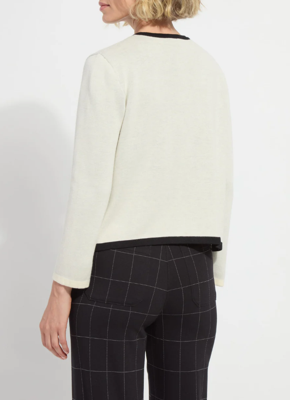 The Amal Sweater Jacket by Lysse is crafted from lightweight double-face cashmere, offering soft, cozy comfort in a classic cropped jacket silhouette. Designed with bracelet-length sleeves that can be cuffed, a true-to-size fit, and refined jacket details, this versatile piece is built to become a wardrobe staple for years to come. Featuring a Black interior, Chalk white exterior, high-shine Gunmetal buttons, and thoughtful binding details, the Amal Sweater Jacket pairs beautifully with the Kavita Crew Neck Shell, Erin High Waist Wide-Leg Ponte Pants, or your favorite tailored separates.