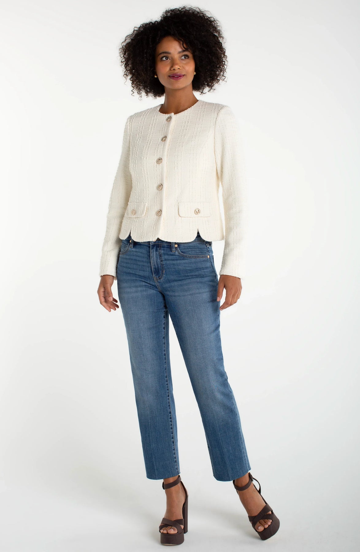 Upgrade your women’s tailored jacket collection with the Jacket With Scallop Detail in Cream by Liverpool. This collarless jacket combines modern softness with classic sophistication, crafted in textured boucle and featuring delicate scalloped edges for subtle charm. The clean button front and gently structured silhouette create a polished yet approachable look, making it a versatile cream jacket that effortlessly elevates office wear, weekend ensembles, or layered women’s outfits with timeless style.