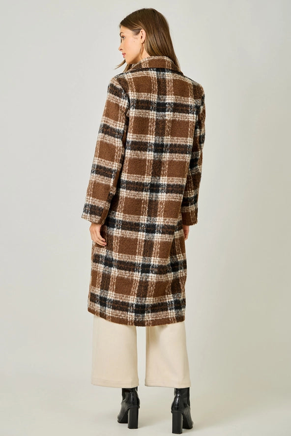 Step into timeless cold-weather style with the Plaid Long Coat, a refined midi-length coat designed in a rich mocha and navy plaid for a classic, polished look. Featuring a structured double-button closure, long sleeves, and functional front bottom pockets, this versatile outer layer blends warmth, comfort, and sophistication. Perfect for workdays, weekends, and holiday outings, this mocha navy plaid coat instantly elevates any winter wardrobe.