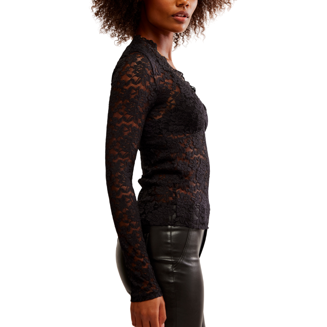 Indulge in luxury with our All Day Lace Long Sleeve. Made of soft, sheer lace, this top features a flattering V-neckline and seamed details for a sensual and sophisticated look. Perfect for adding a touch of elegance to any outfit.