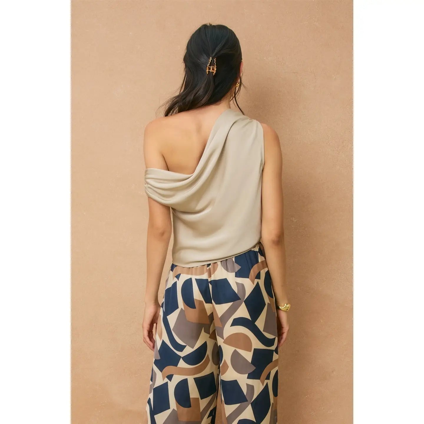 Elevate your look with the Satin Asymmetrical Top in Champagne, a refined statement piece designed for effortless elegance. Featuring a modern one-shoulder top silhouette with soft shirring detail sleeves, this lustrous satin blouse drapes beautifully for a polished yet relaxed fit. The easy pull-on top design offers comfort without elastic or smocking, while the champagne hue adds a timeless, sophisticated glow—perfect for evenings out or elevated daywear.