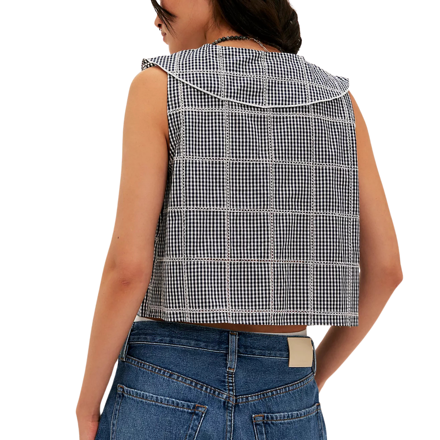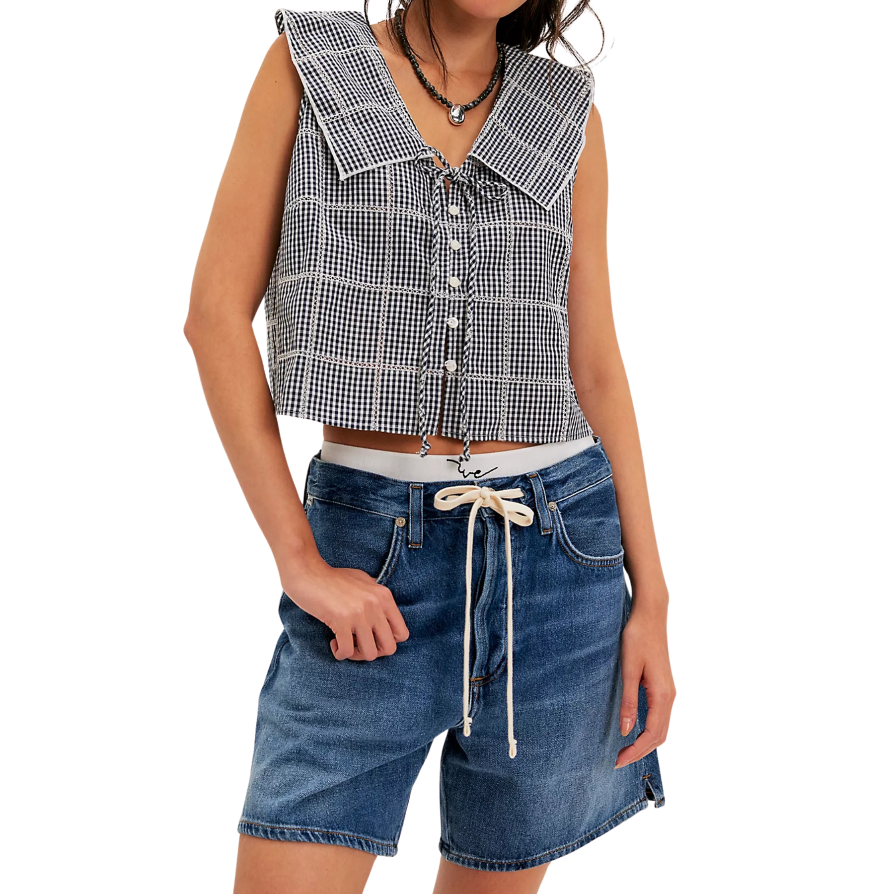 Go retro-chic with the Waiting For Me Top in Navy by Free People, a standout piece in women’s summer tops. This plaid cropped top features a sleeveless design, a wide collar, button-front closure, and playful tie detail. Crafted from soft cotton with a relaxed, boxy fit and flattering V-neckline, it’s perfect for pairing with high-waisted shorts, skirts, or jeans for effortless summer outfit styling.
