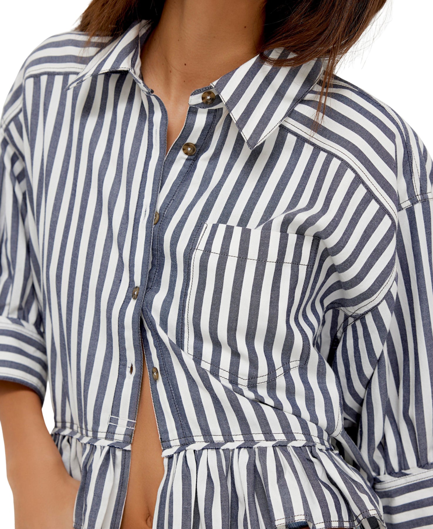Refresh your wardrobe with the Bailey Stripe Shirt in Navy by Free People. This relaxed, hip-length shirt features striped cotton fabric, a collared neckline, ¾ drop-shoulder sleeves with cuffs, and a ruffled hem for a playful twist on a classic menswear style.