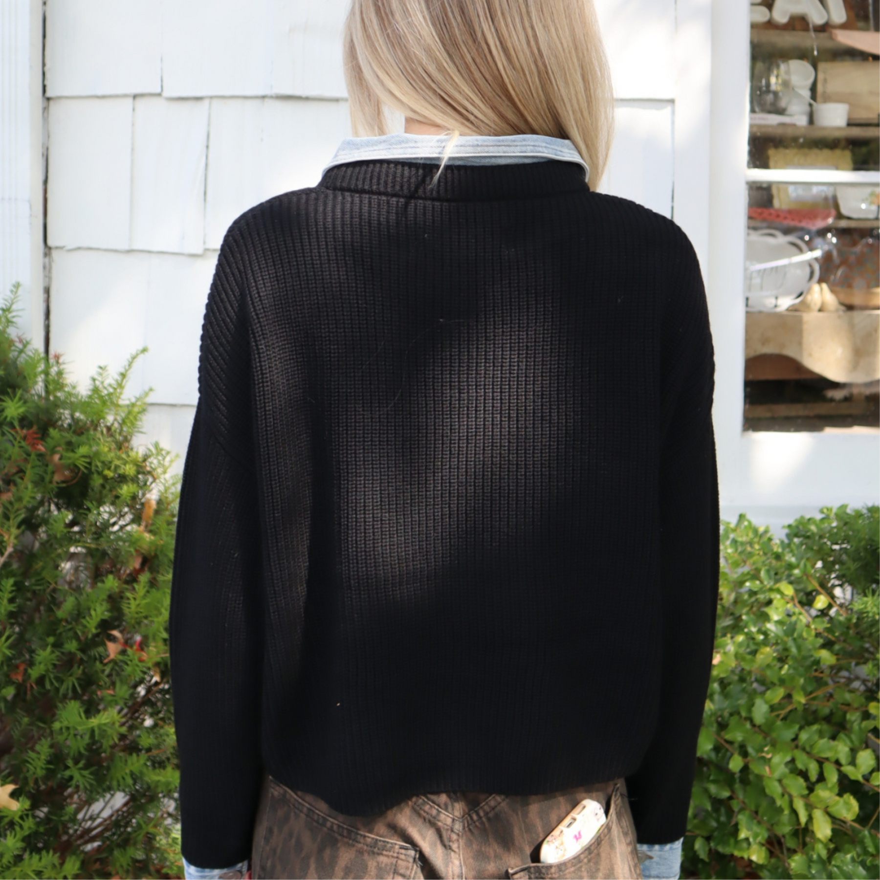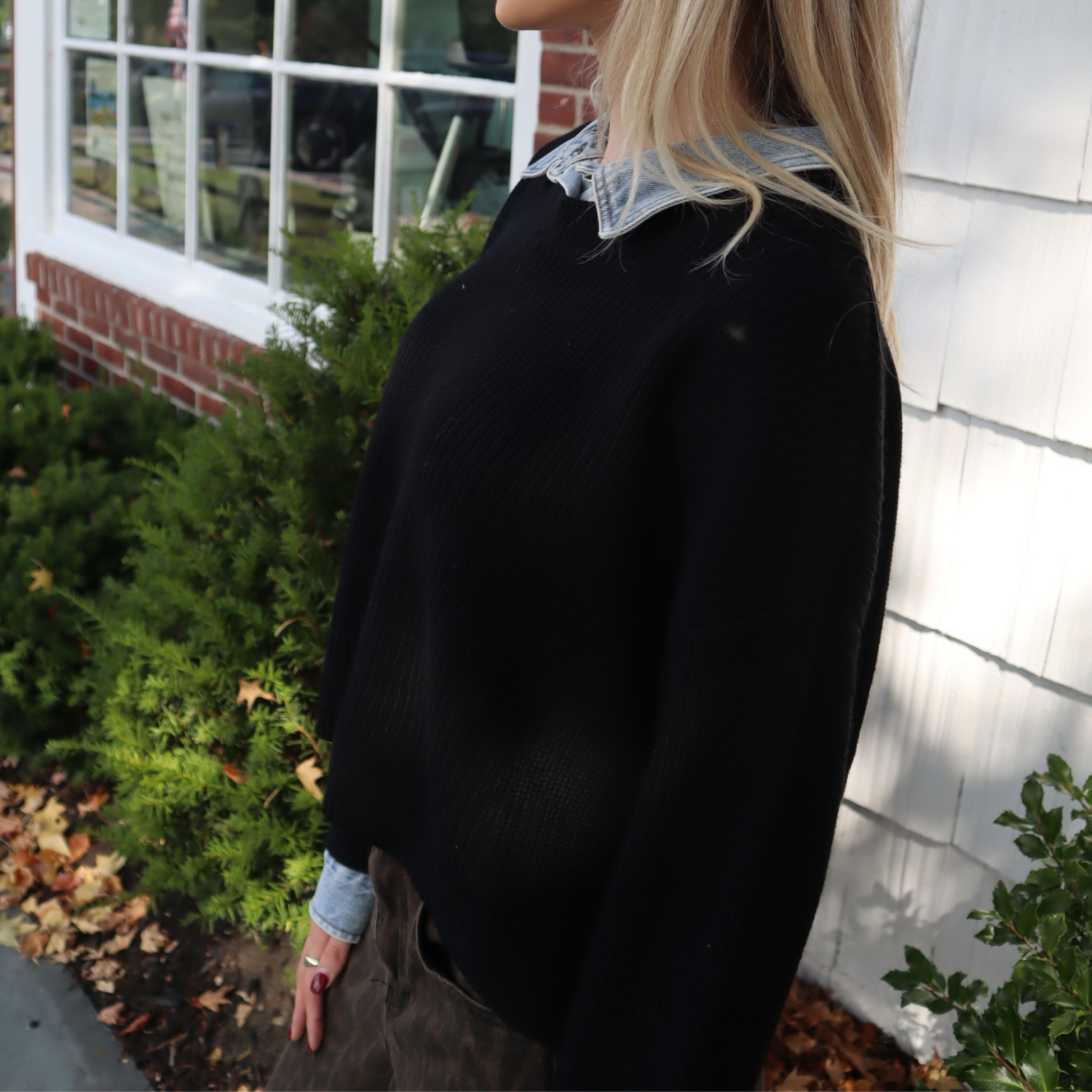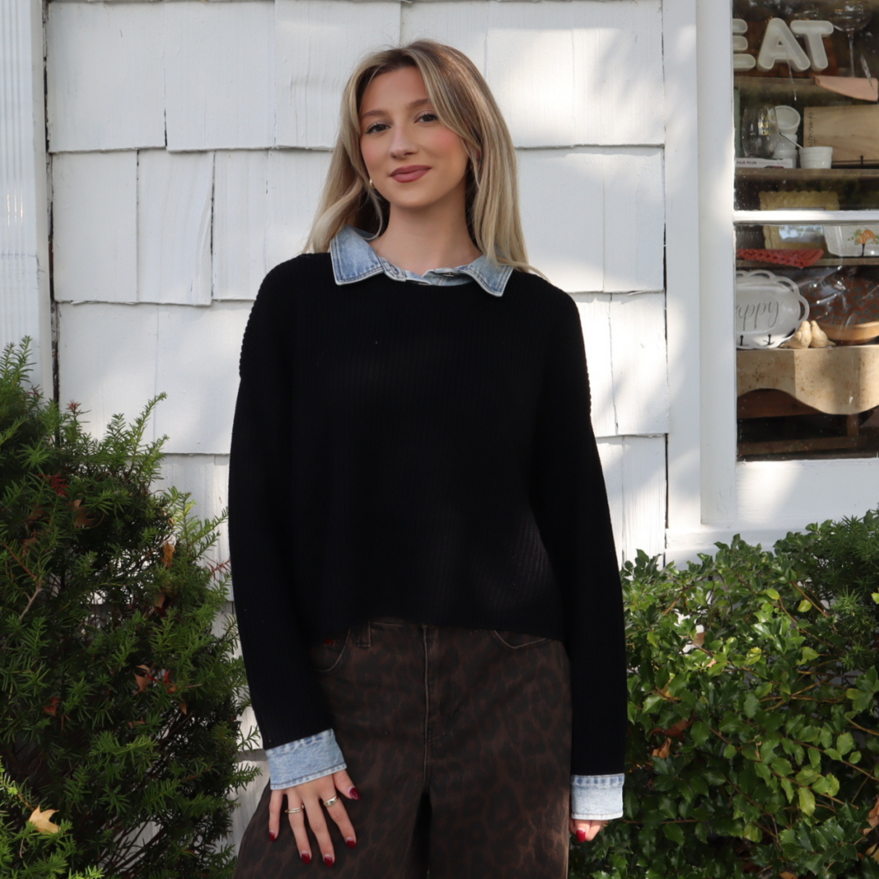 Blending classic style with everyday ease, the Denim Sweater in Black features a soft knit body accented by a uniquely textured denim collar and cuffs for subtle contrast and added durability. This versatile piece offers casual comfort with a refined edge—perfect for effortless layering throughout the season.
