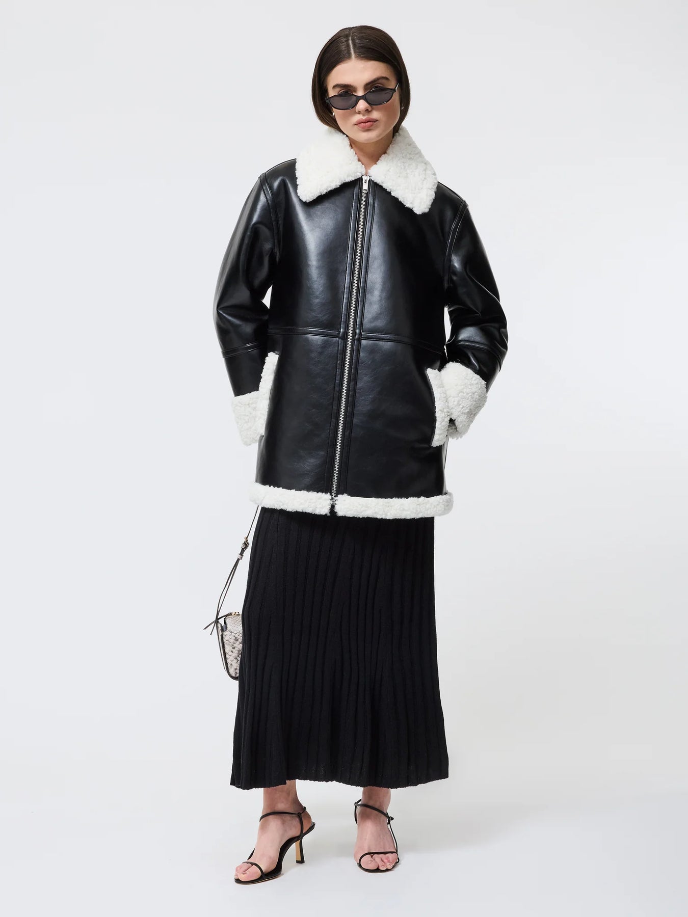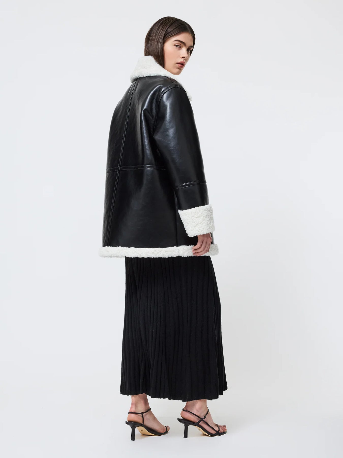 Cooler than your average puffer. The French Connection Ajani Vegan Shearling Coat delivers standout style and warmth in one sleek design. Made from smooth black vegan leather and lined with plush faux shearling, this coat offers a luxurious feel with a modern, cruelty-free edge.