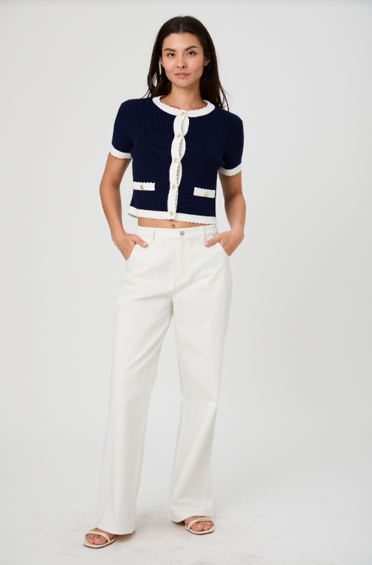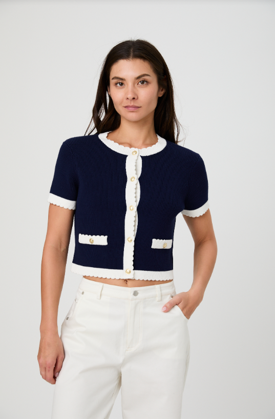 The Bennett Cable Knit by French Connection is a modern take on a classic cable knit sweater, designed for spring and summer wear. Crafted from a soft, flexible blend of viscose and PBT, this short-sleeve knit top offers a lightweight feel with just the right amount of structure and stretch. Featuring a timeless navy colorway, this women’s cable knit is elevated by delicate scalloped detailing, adding a feminine, refined touch to a casual silhouette. The short sleeves make it ideal for warm days, while the textured cable knit pattern delivers effortless polish.