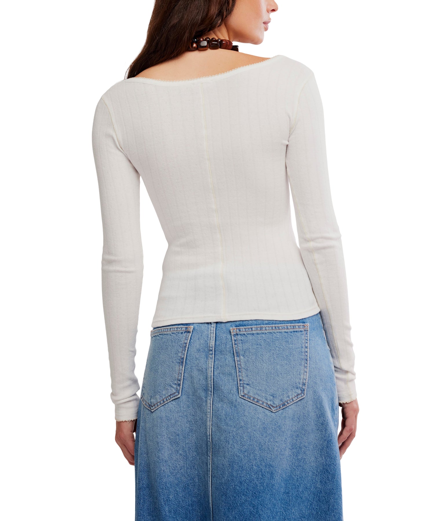 The End Game Pointelle Long Sleeve in Sugar Swizzle by Free People is a chic, versatile essential for any wardrobe. Made from soft pointelle cotton top fabric, this fitted long sleeve shirt features a classic button-up front, delicate scalloped trim, and subtle textured detailing. Perfect for layering or wearing alone, this Free People long sleeve top combines cozy comfort with timeless style.