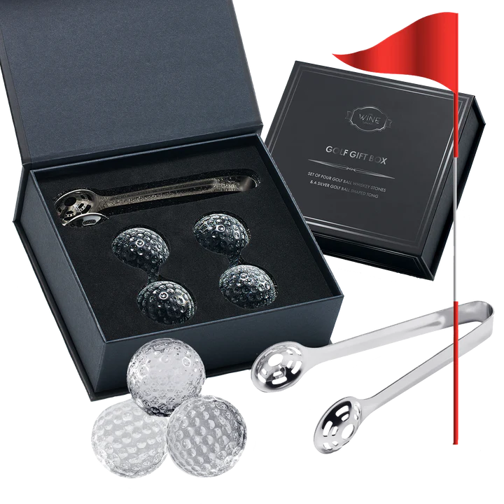 - This package features a complete set of whiskey rocks, comprising four pieces shaped like golf balls, stainless steel tongs, and a gift box with soft cotton lining. It's a perfect ensemble for those who enjoy both golf and whiskey.