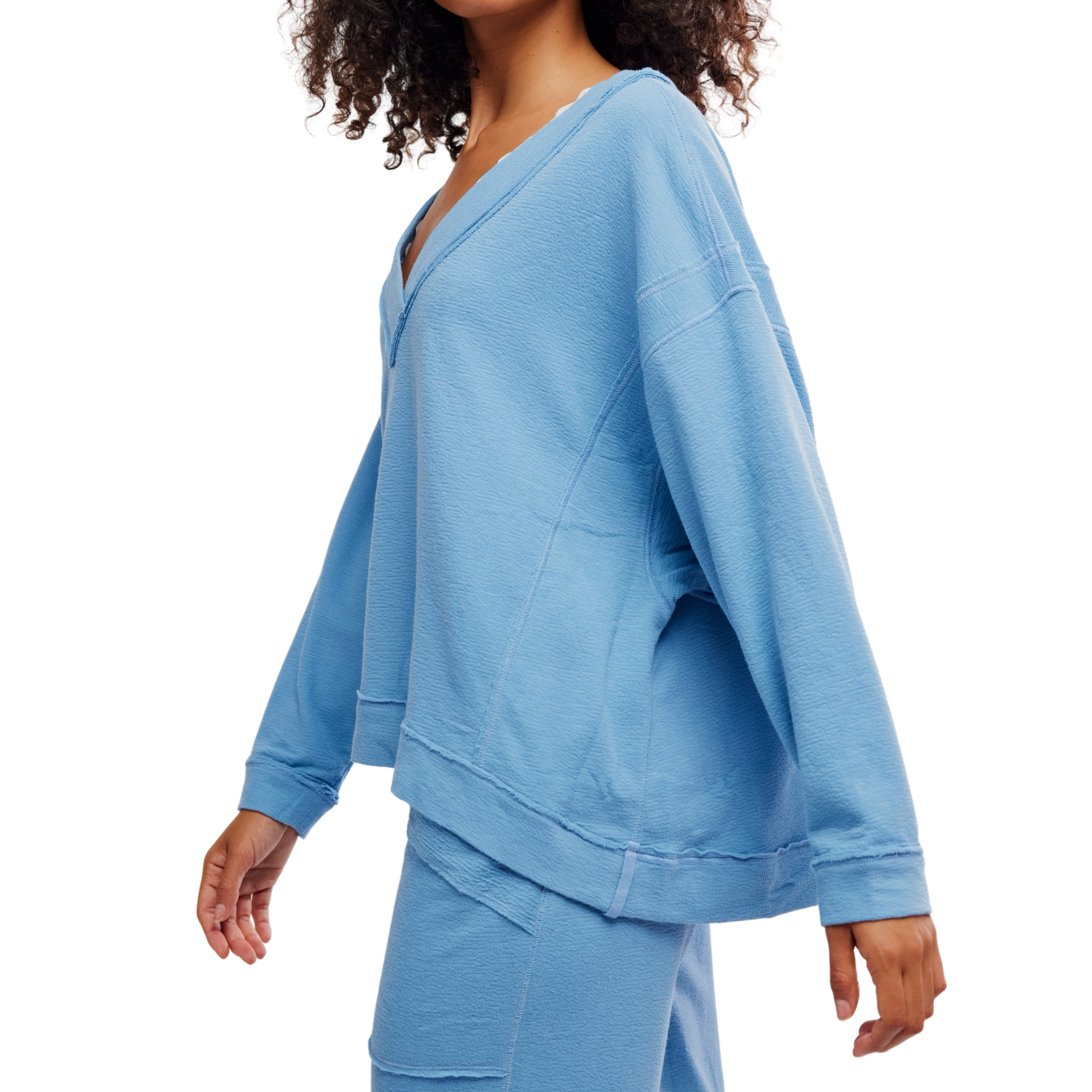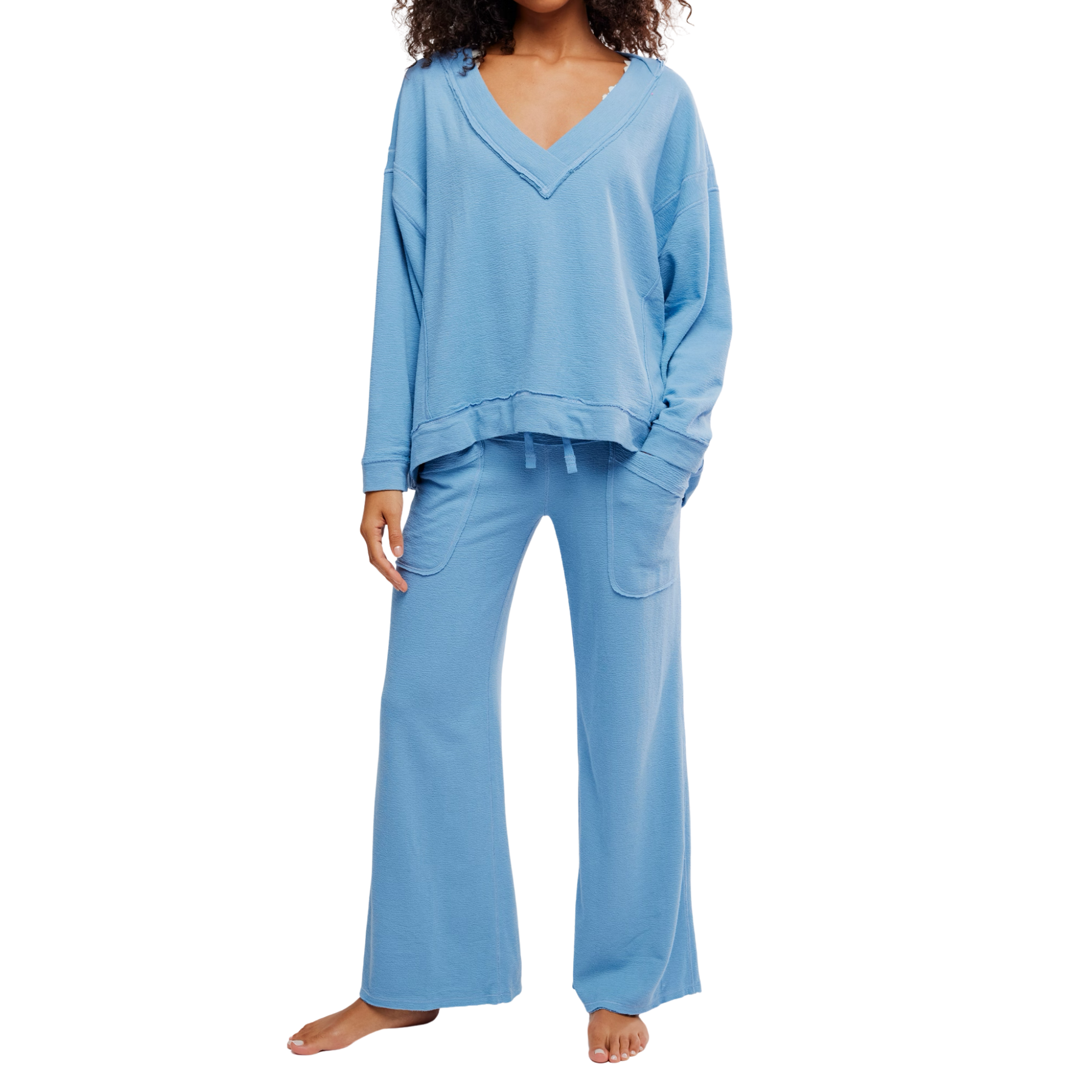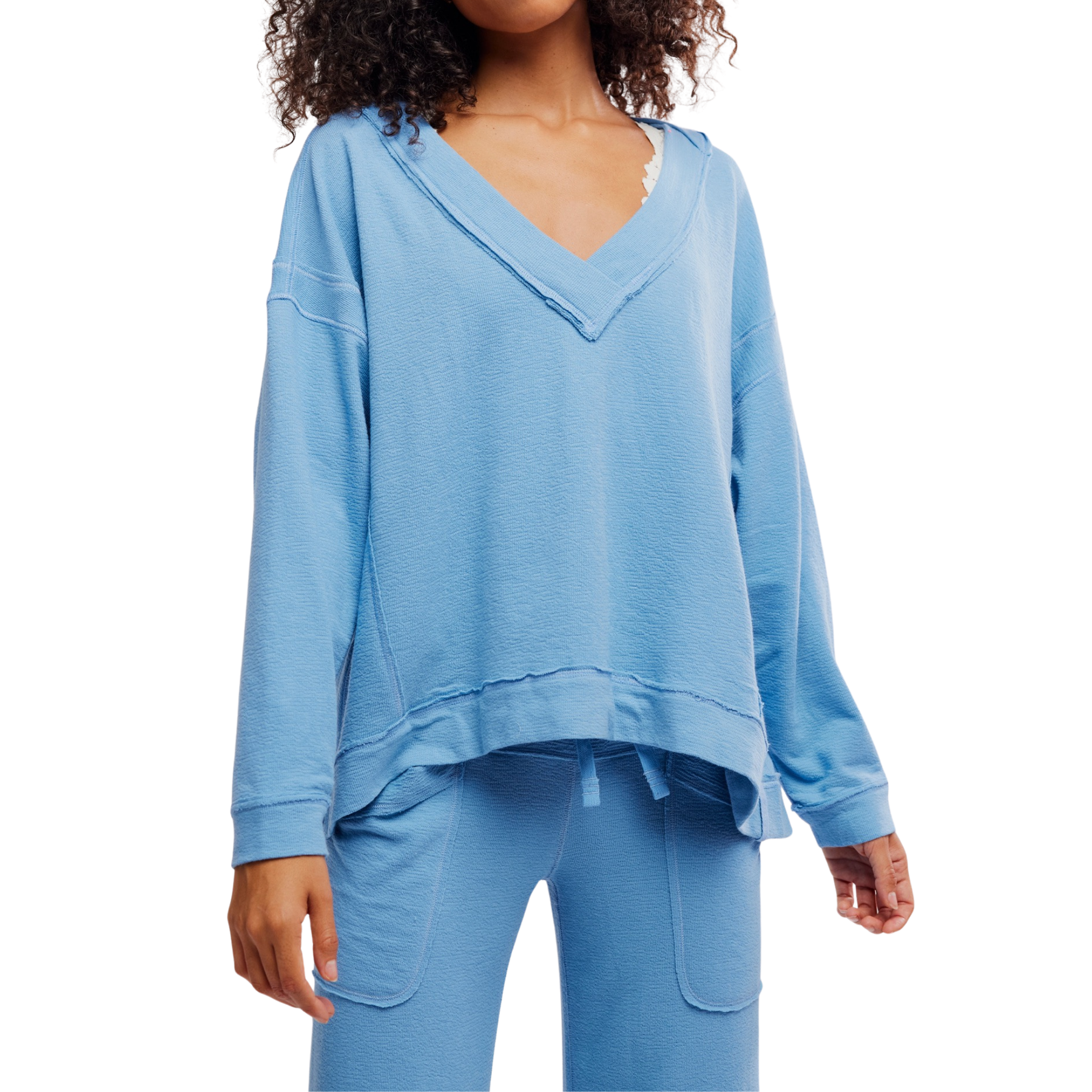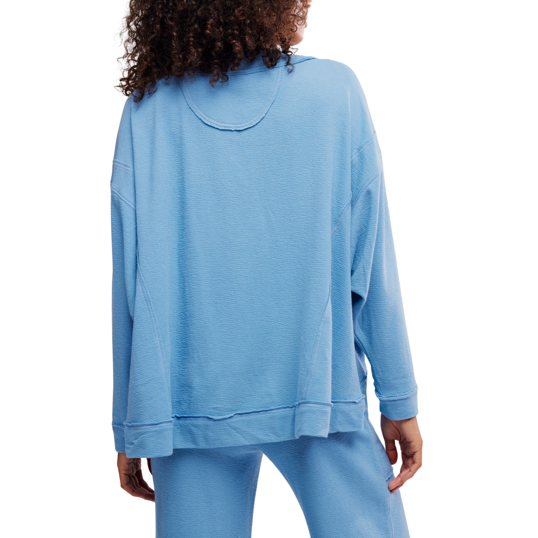 Elevate your off-duty wardrobe with the Staycation Pullover in Blissful Blue by Free People — a refined women’s cozy pullover sweatshirt designed for effortless style and comfort. Crafted from ultra-soft fabric with a relaxed, high-rise silhouette, this comfortable lounge top pairs perfectly with joggers or jeans for a laid-back yet polished look. Ideal for home, errands, or casual outings, it’s a versatile everyday loungewear essential that blends modern ease with timeless appeal.